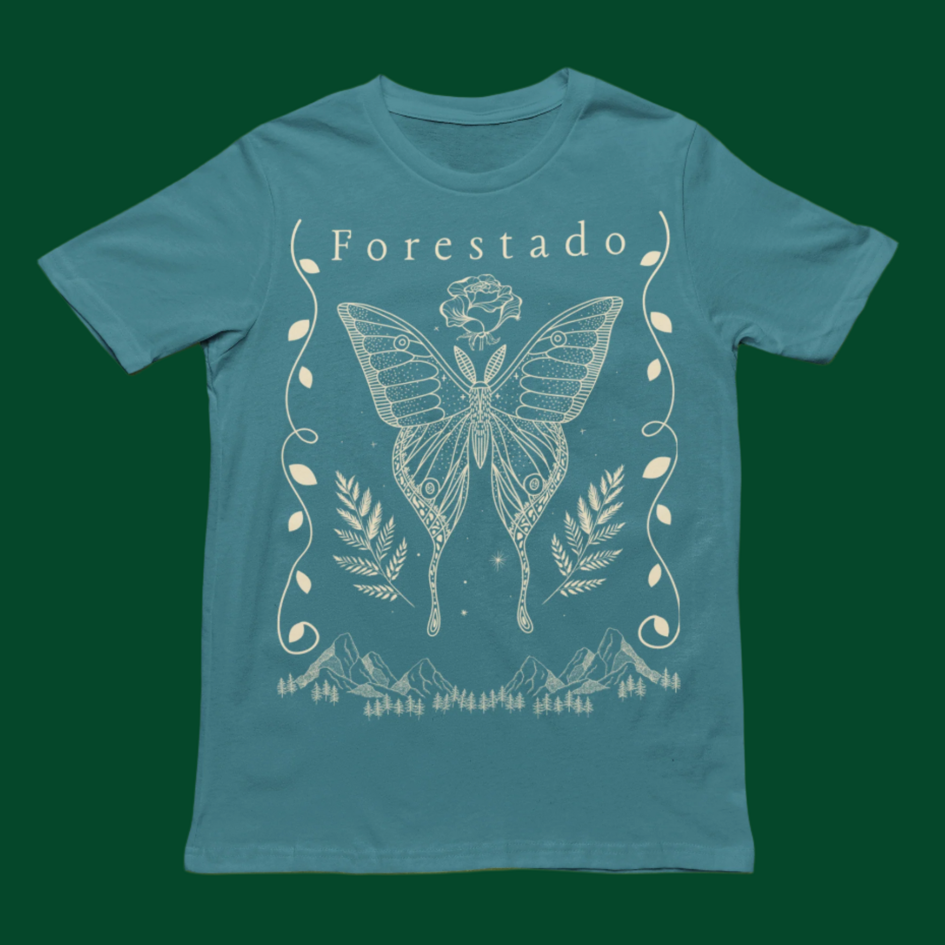 Drift into a world of ethereal beauty with Gossamer Reverie. This design embodies the delicate grace of a celestial moth, its wings adorned with intricate details that whisper of transformation and mystery. Framed by wild ferns, cosmic elements, and distant mountain peaks, it evokes the harmony between nature and the unseen. A single blooming rose crowns the composition, symbolizing fleeting beauty and the dreamlike passage of time.