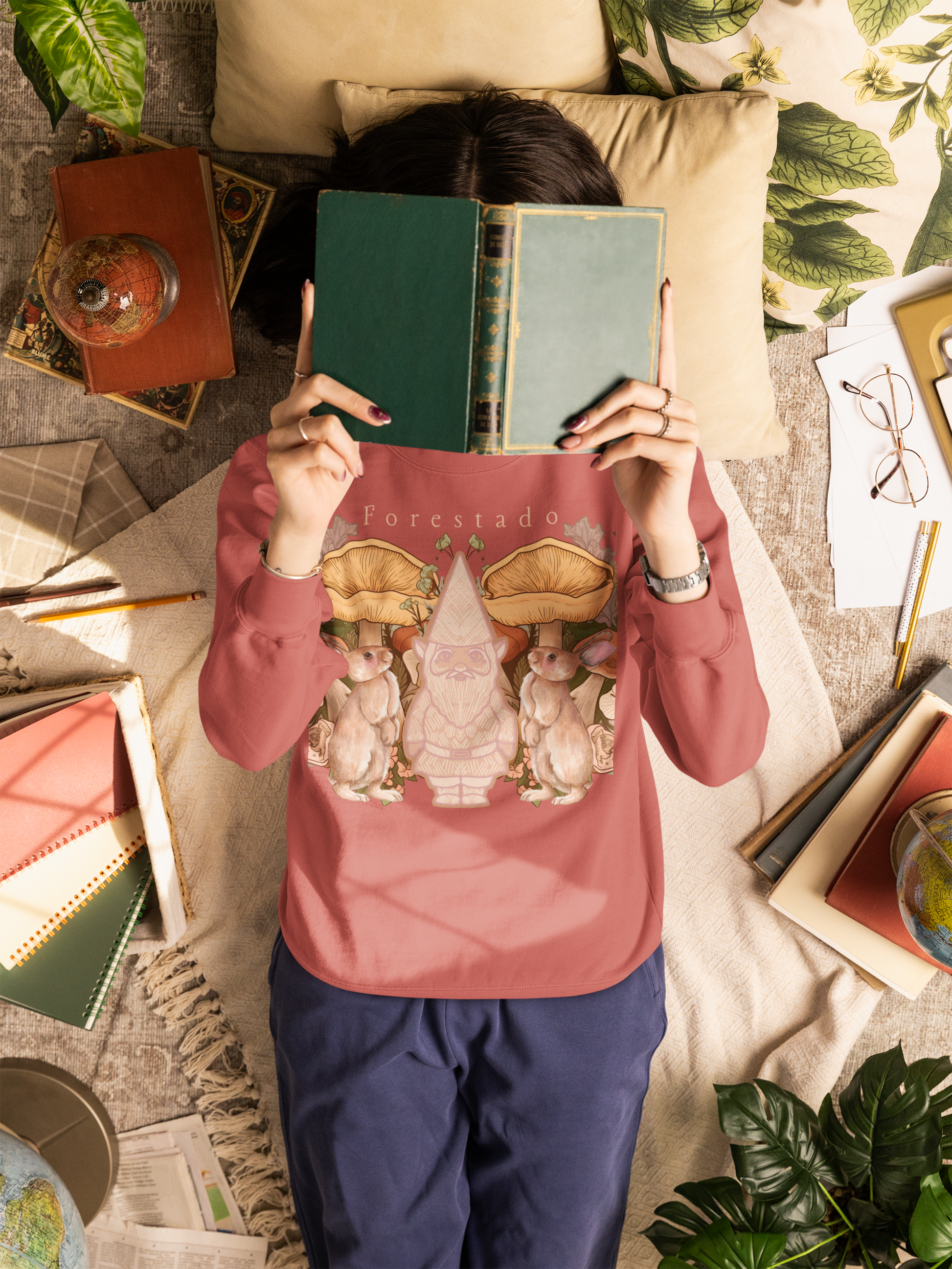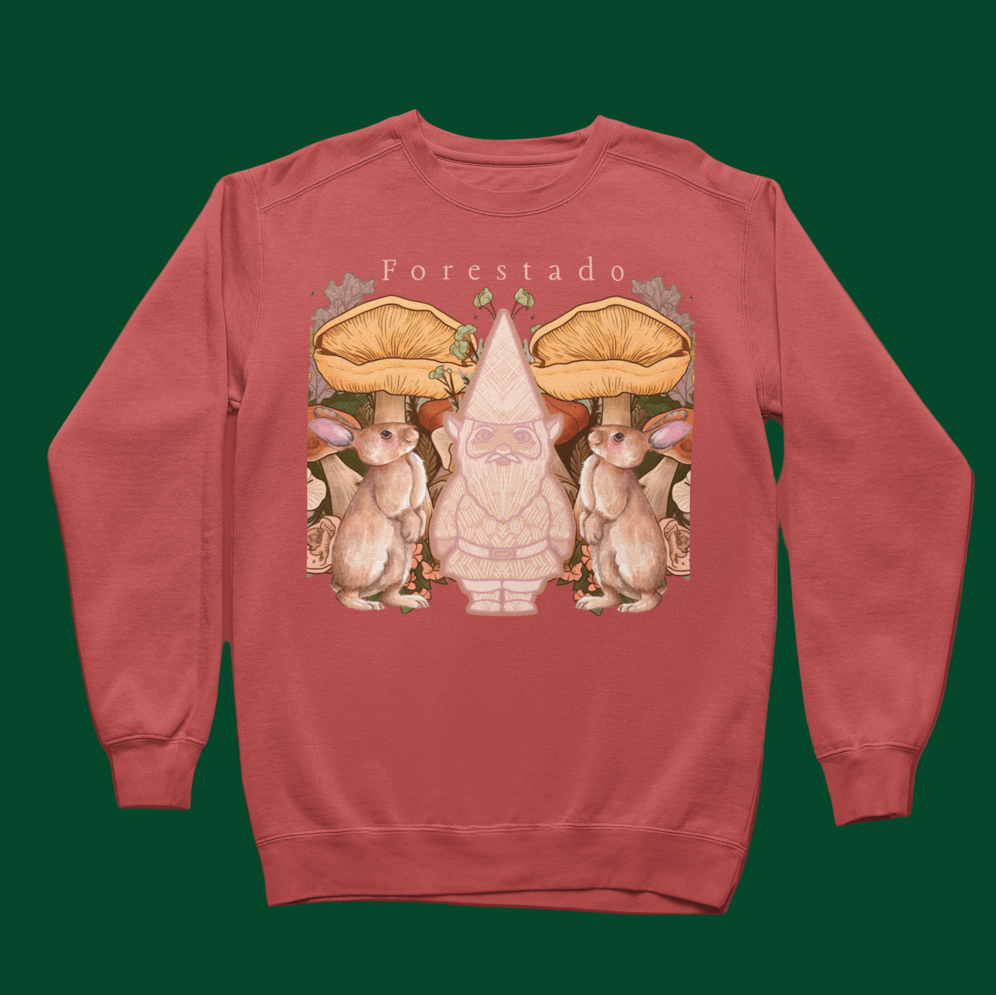 Whimsy grows where the forest floor comes alive. A gnome stands between mirrored rabbits, watched over by towering mushrooms and encircled with flowers and ivy. Mushroom Dance is a playful emblem of woodland folklore — cozy, witchy, and a little mischievous, like a story that lives between the trees.